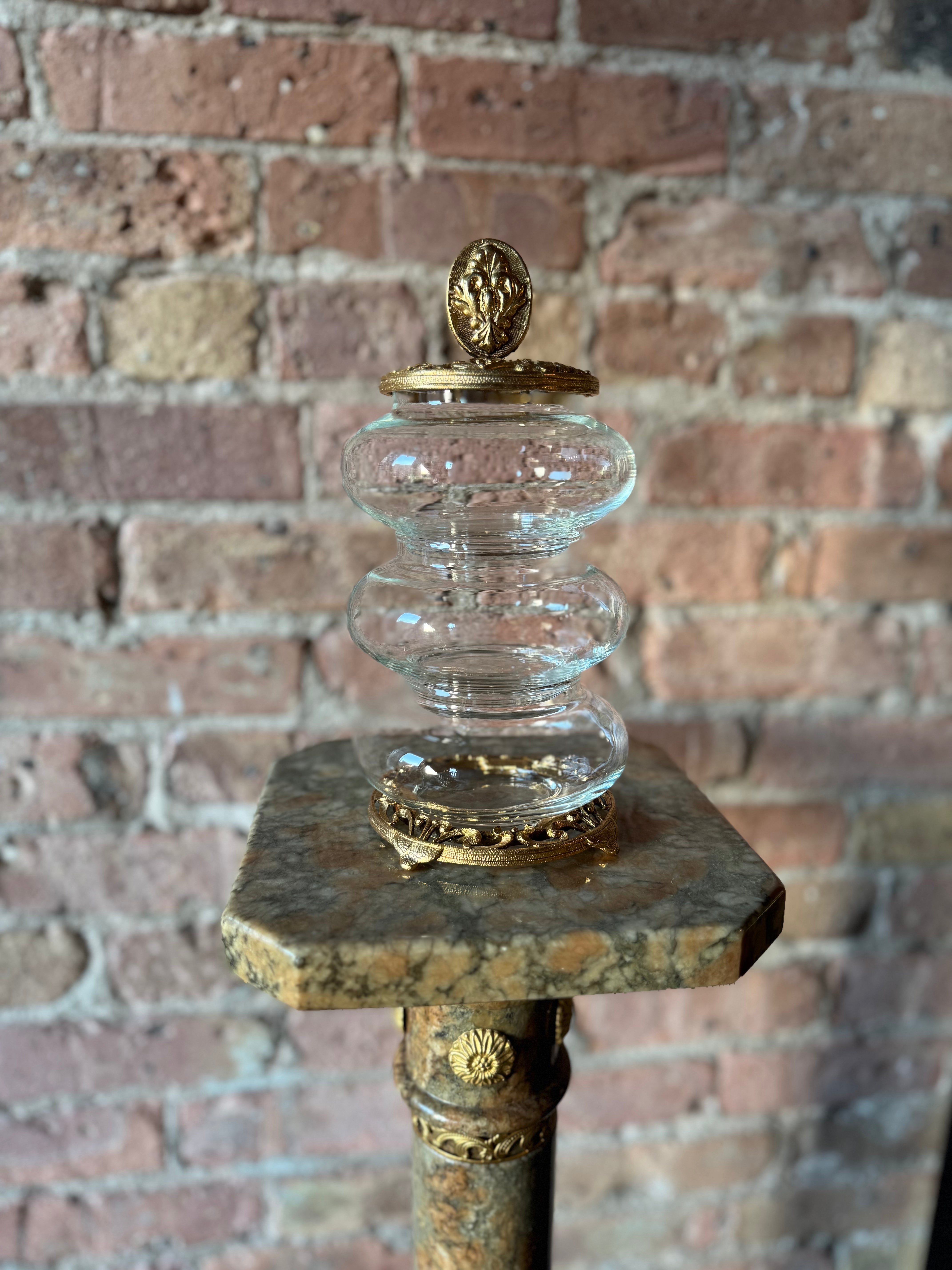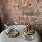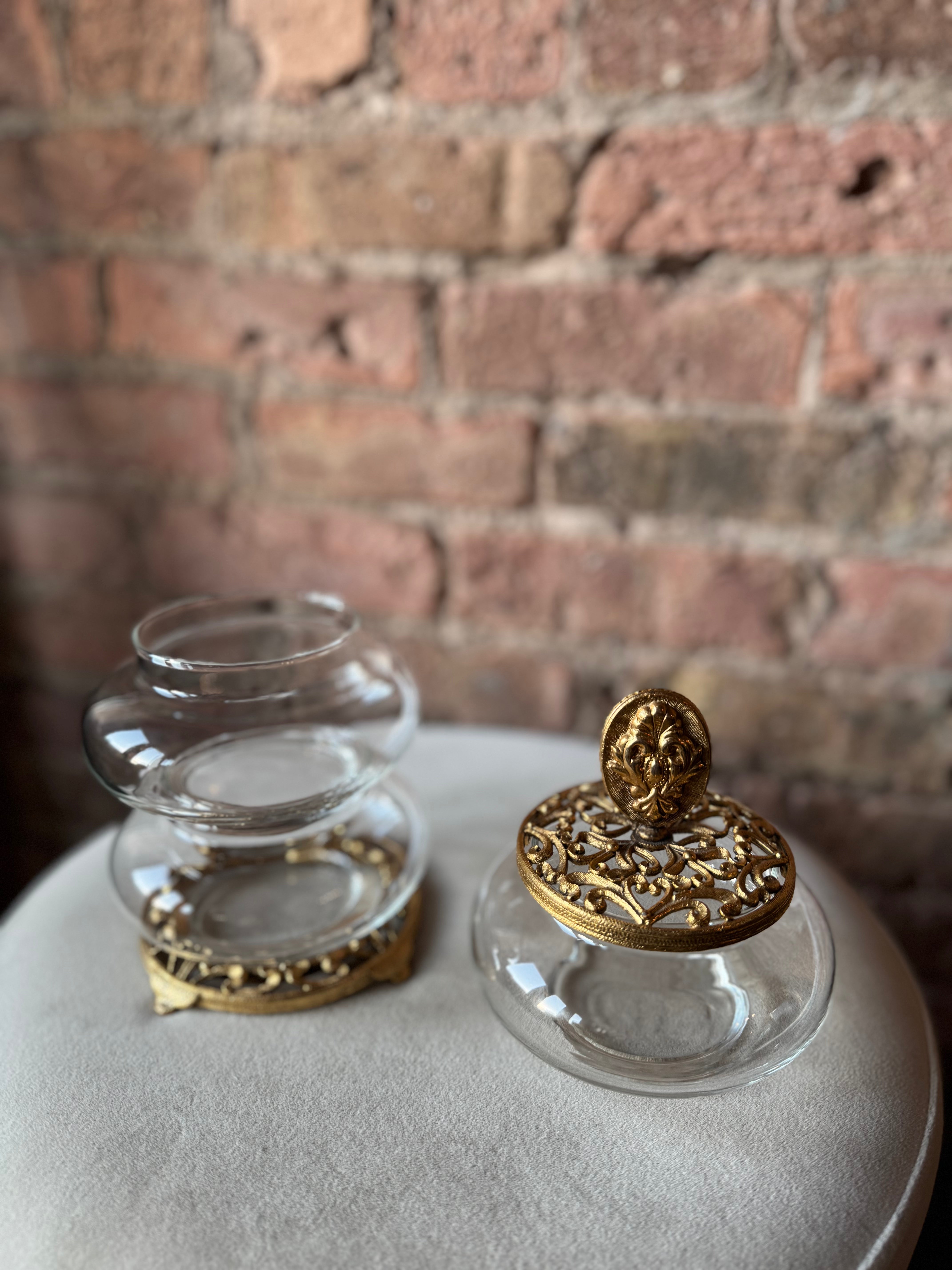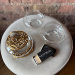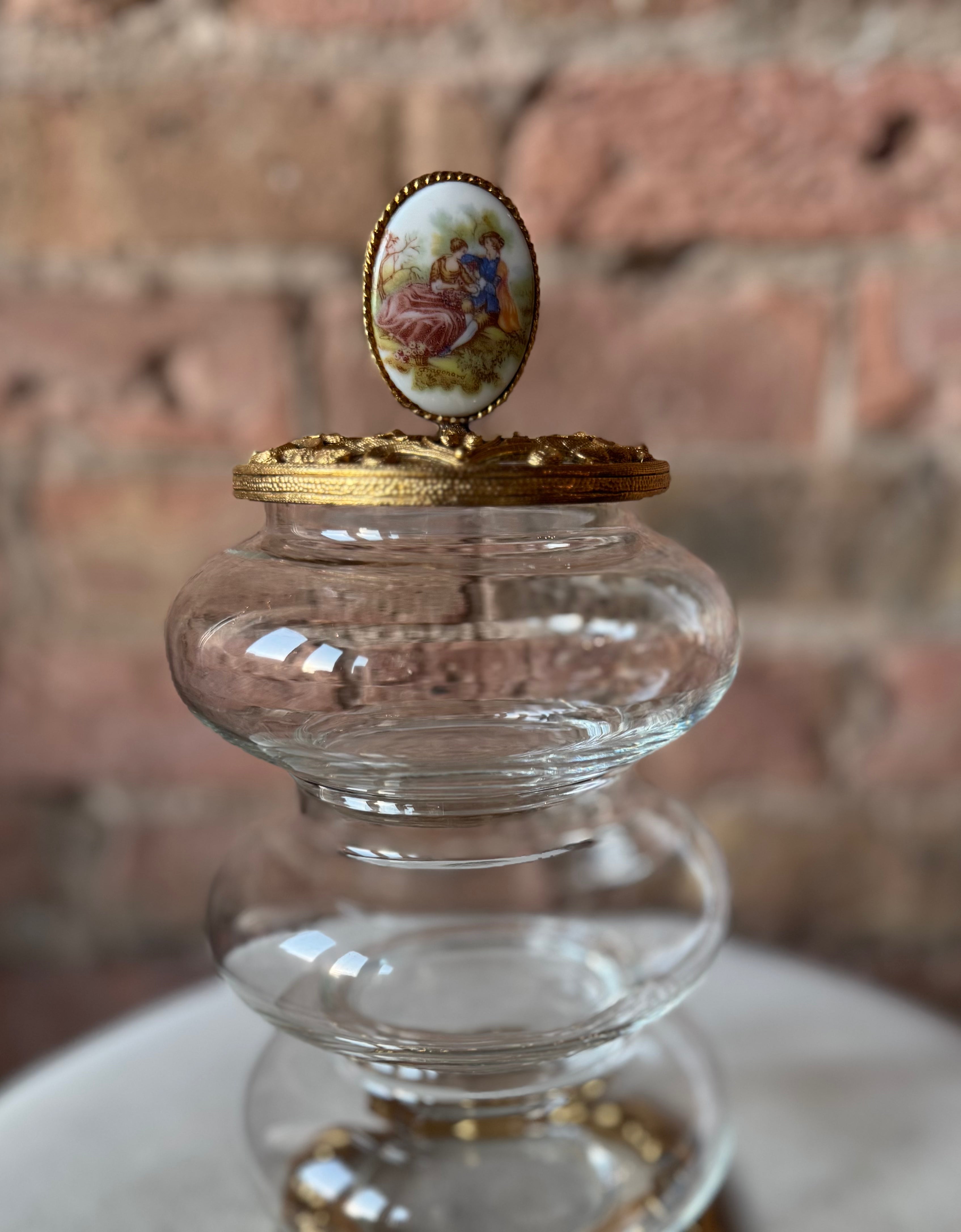 This enchanting triple-candle stacking jar is magical! Adorned with an exquisite porcelain cameo depicting a courting scene, it's framed in ornate ormolu and glass that practically whispers vintage elegance. The fact that you can't find another one like it? That's because this is genuinely one-of-a-kind magic. 24oz