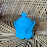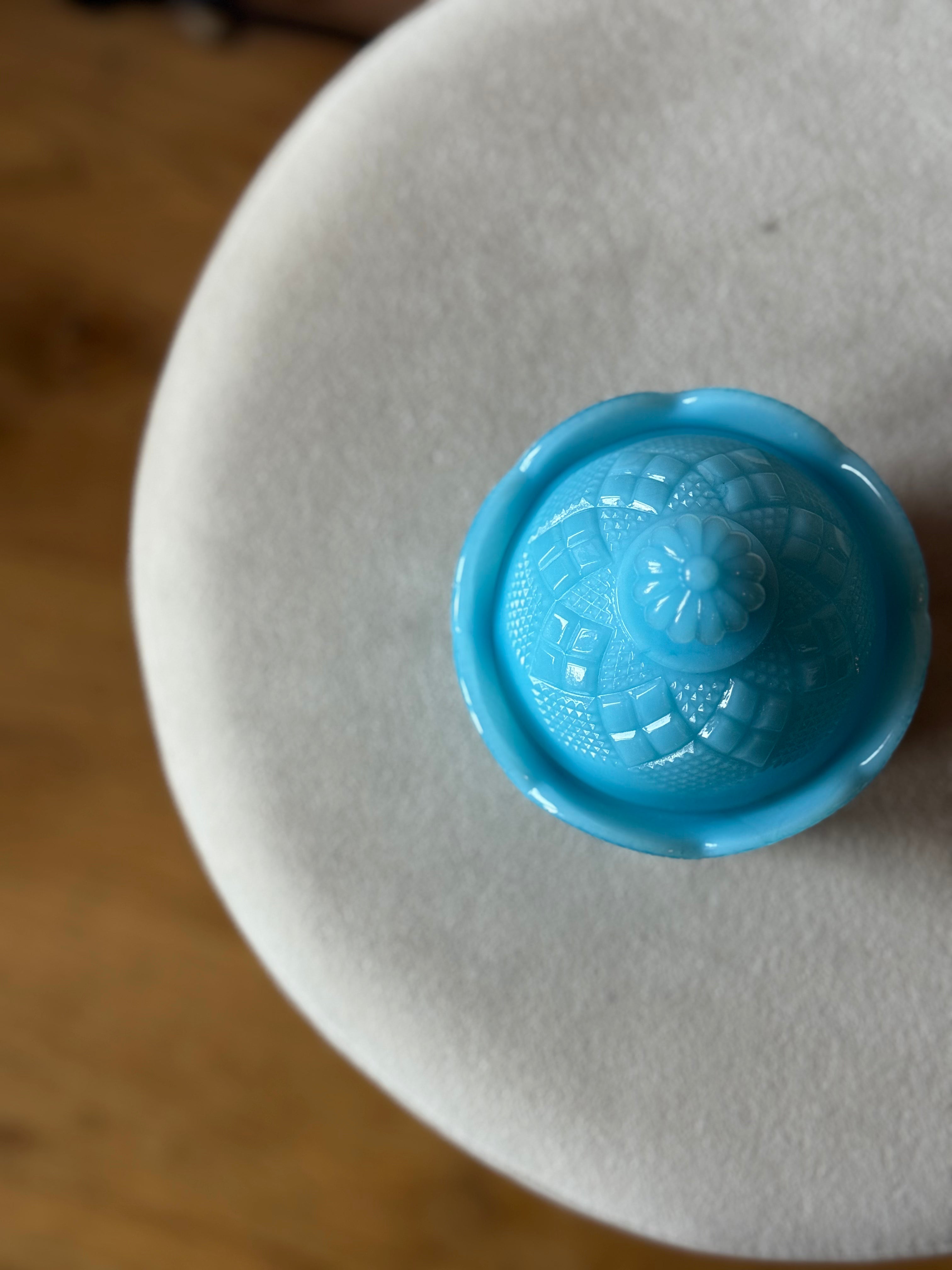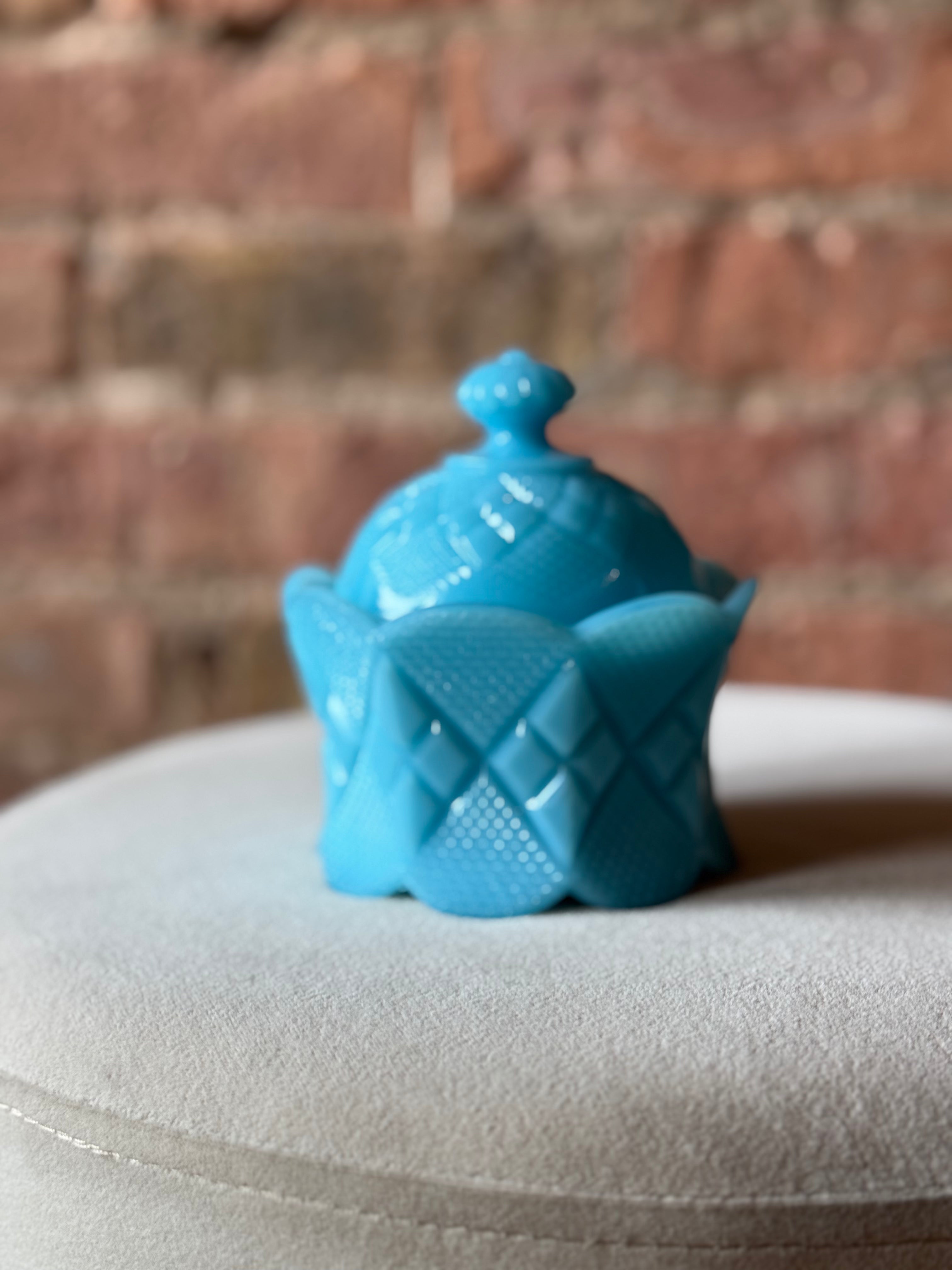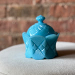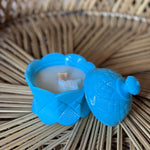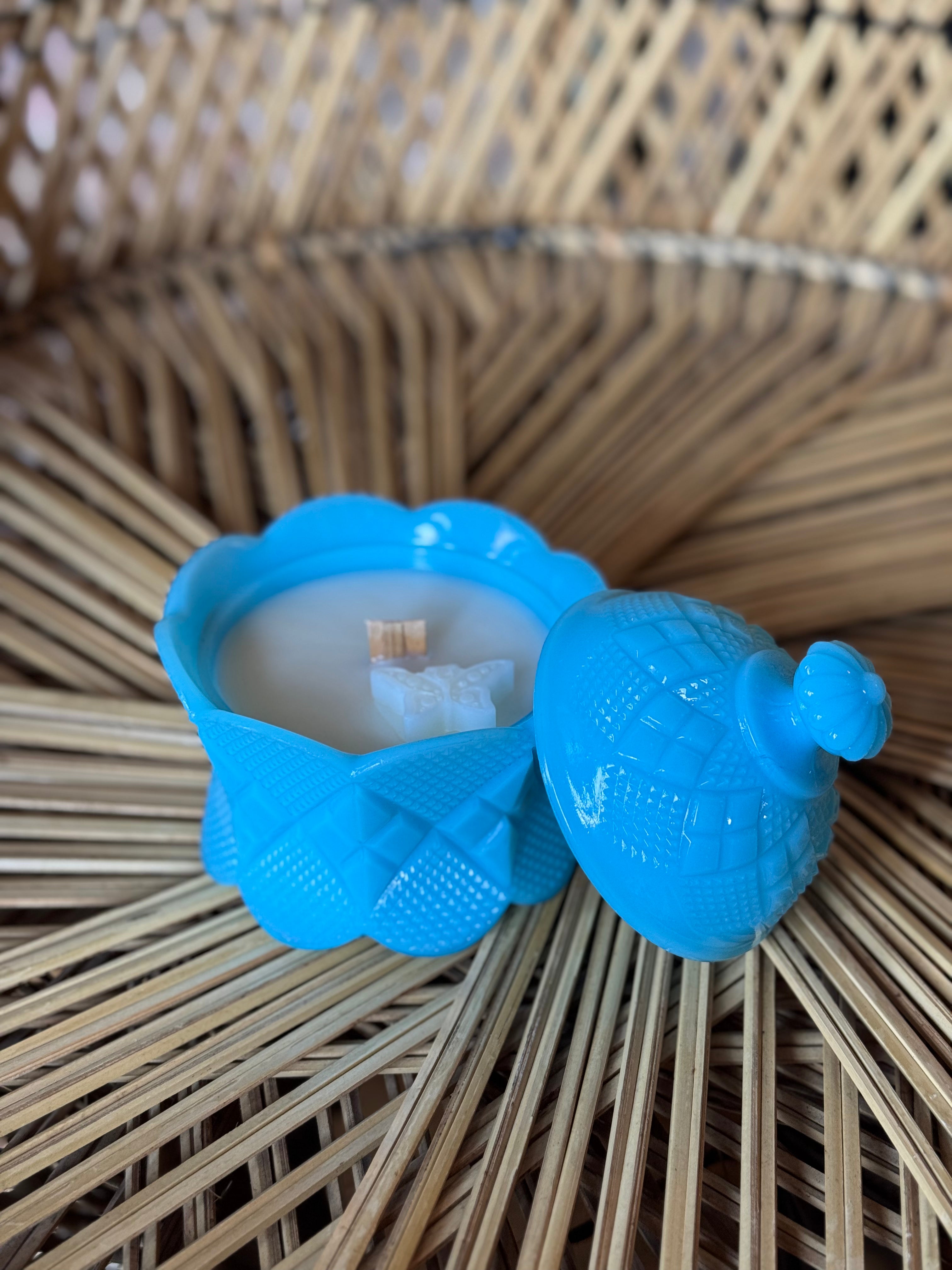 This playful milk glass candle brightens any space with its adorable detailed lid and a cheerful pop of turquoise. Perfect as a charming accent or gift, it adds a splash of color and a cozy glow that makes every moment a little more delightful. 7oz
