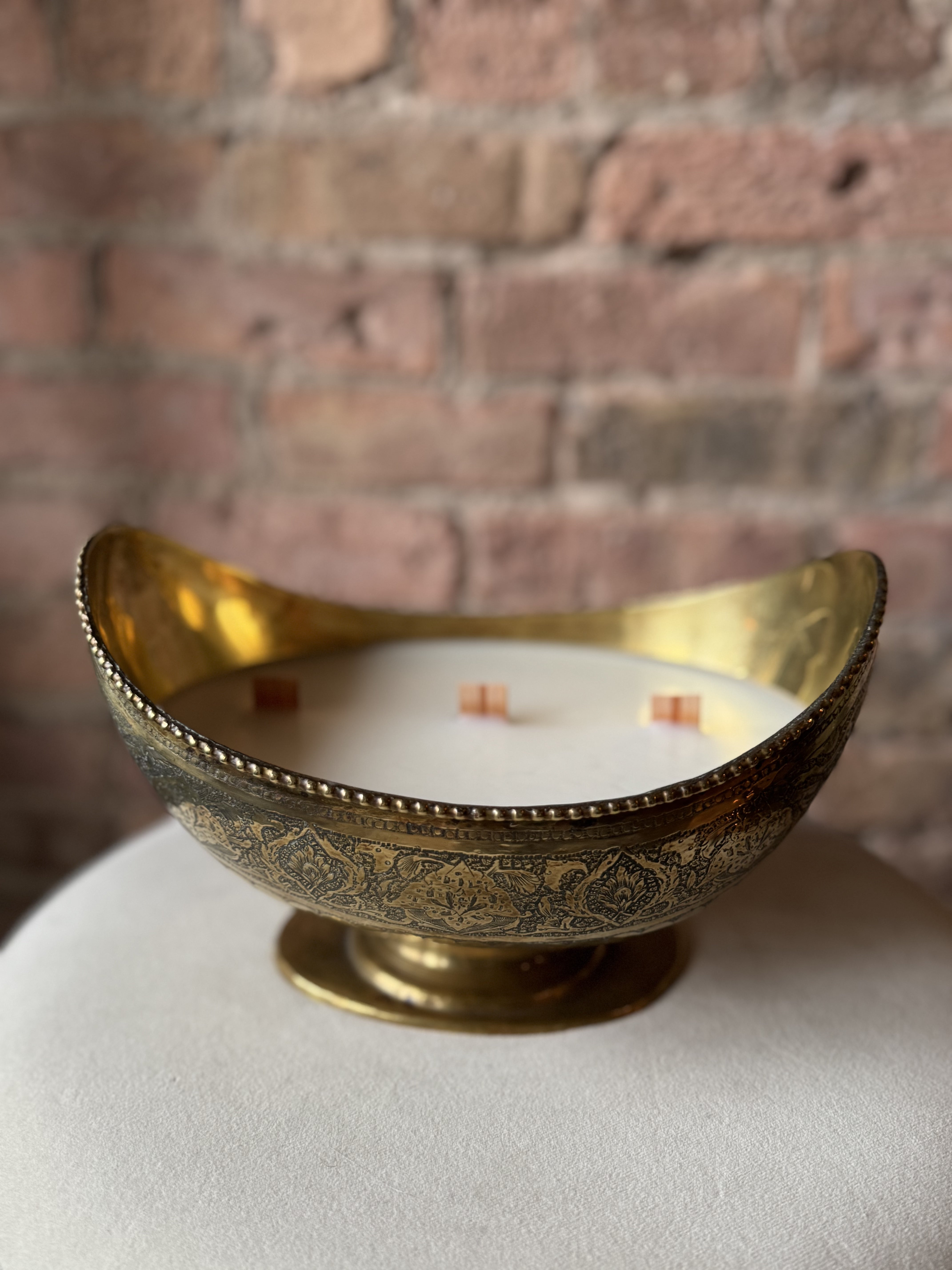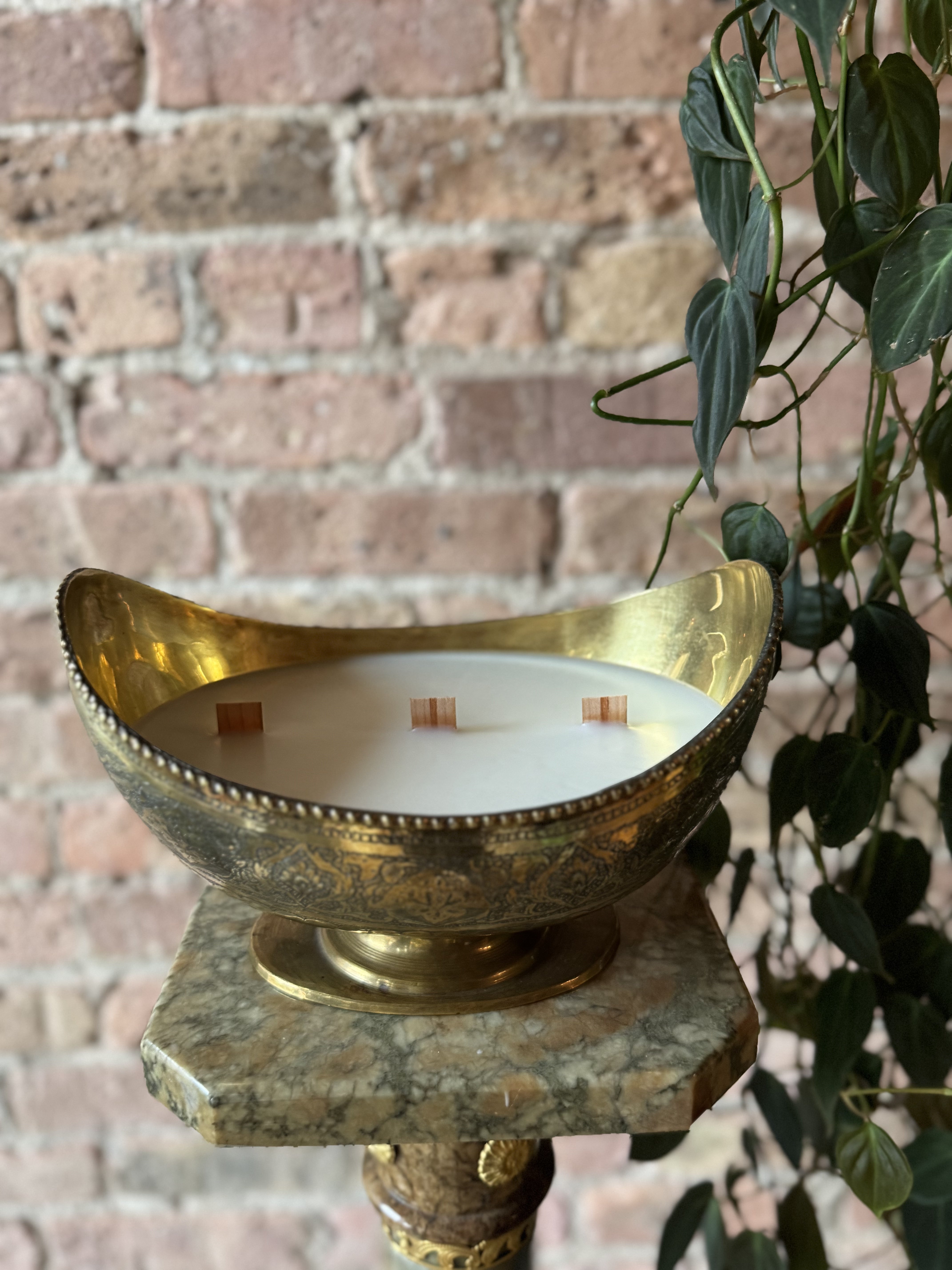 Eleventh House antique candle vessel after being filled with non-toxic wax and wooden wicks