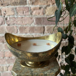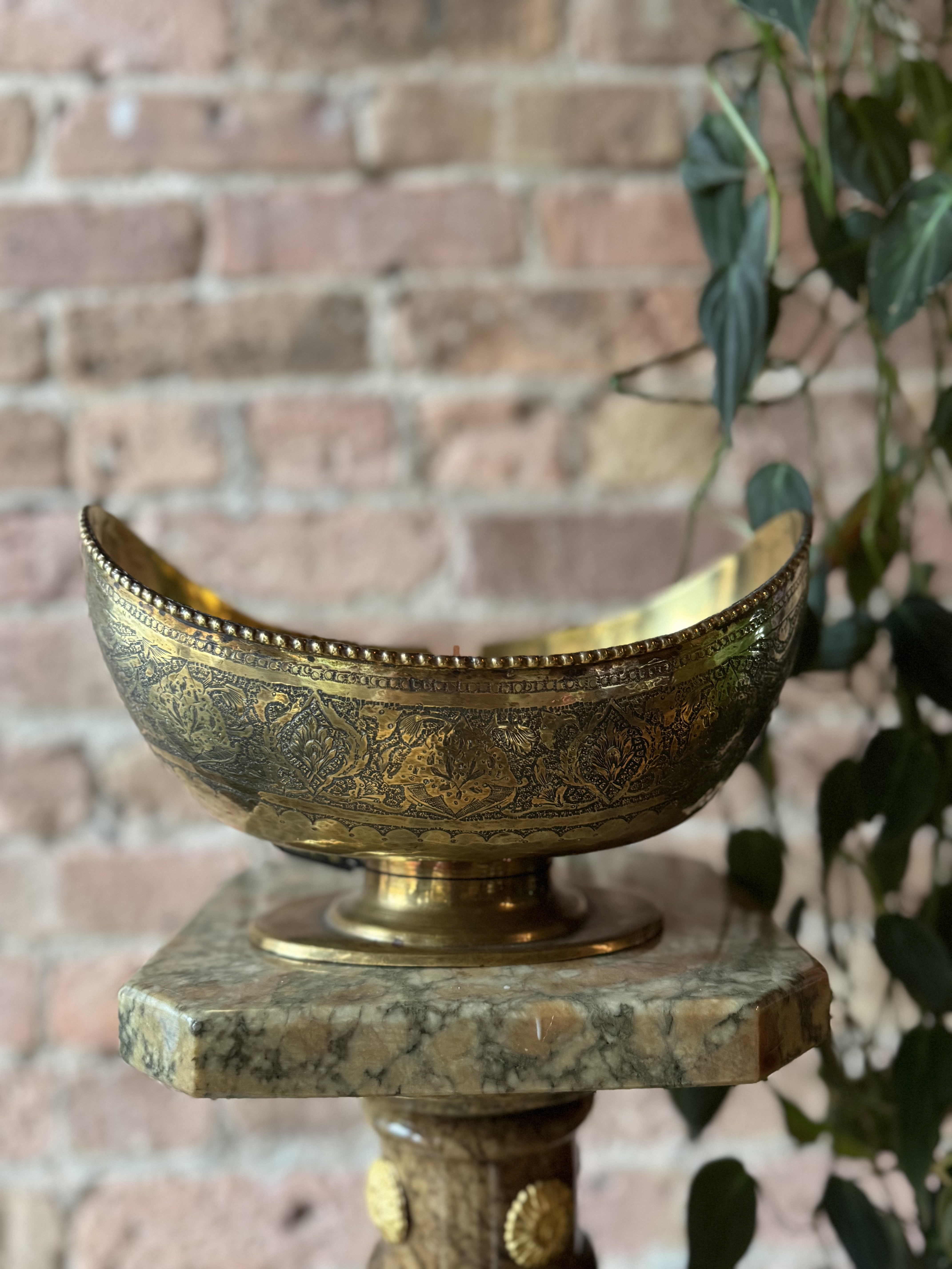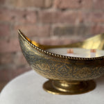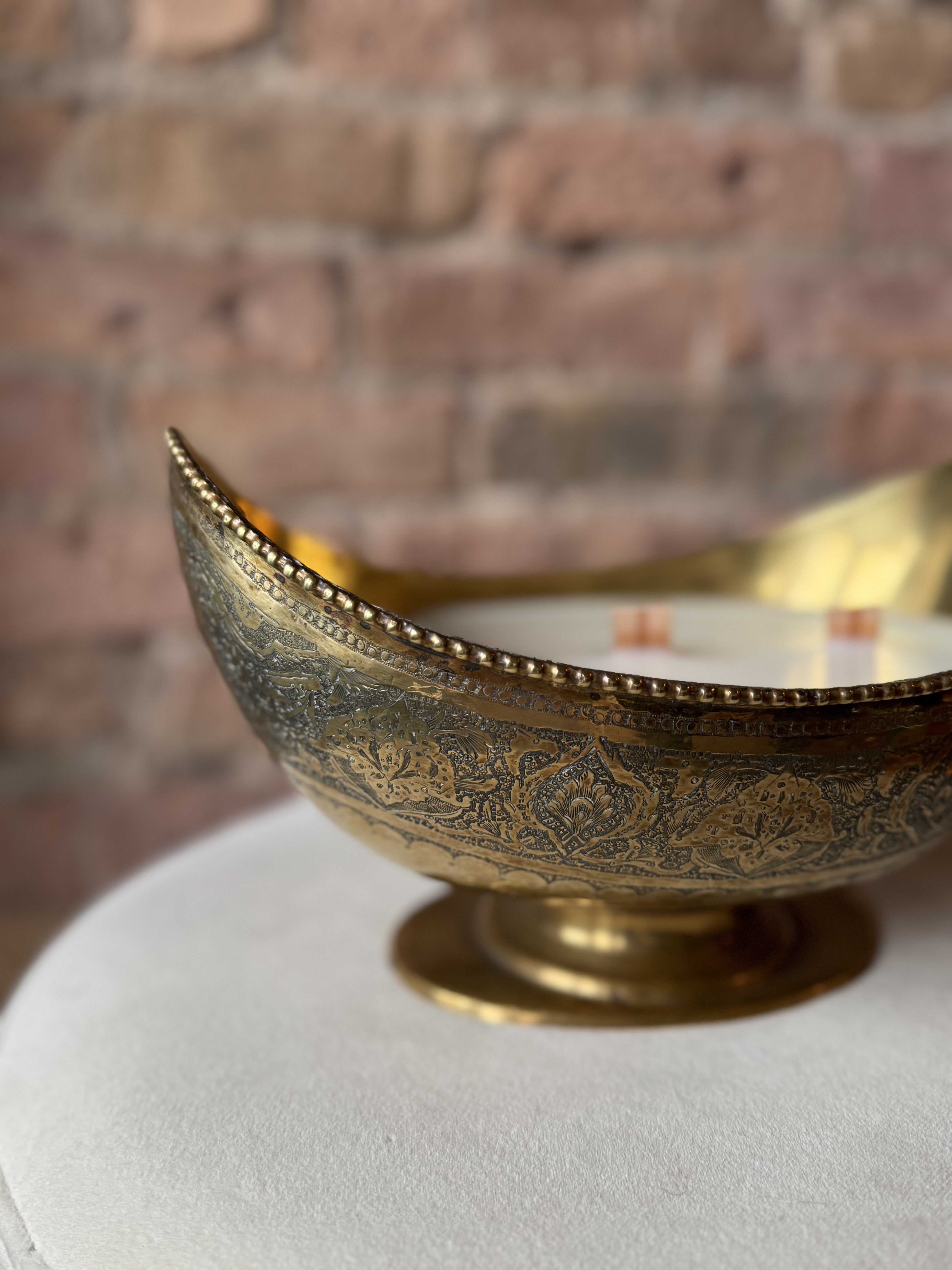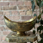 Indulge in Moroccan style vibes with this stunning 40oz antique begging bowl. Adorned with intricate etching and a crescent moon shape, this ornate brass piece will add an exotic touch to any table setting.