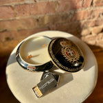 Perfect for the man cave or Regal Lover! Made from vintage black ceramic, it features a hand painted Fleur De Lis, Laurel Wreath Imperial crown by Andrea by Sadek. Show off your regal side with this unique piece of home decor. No knights in shining armor required! *20oz of Edyth wax included