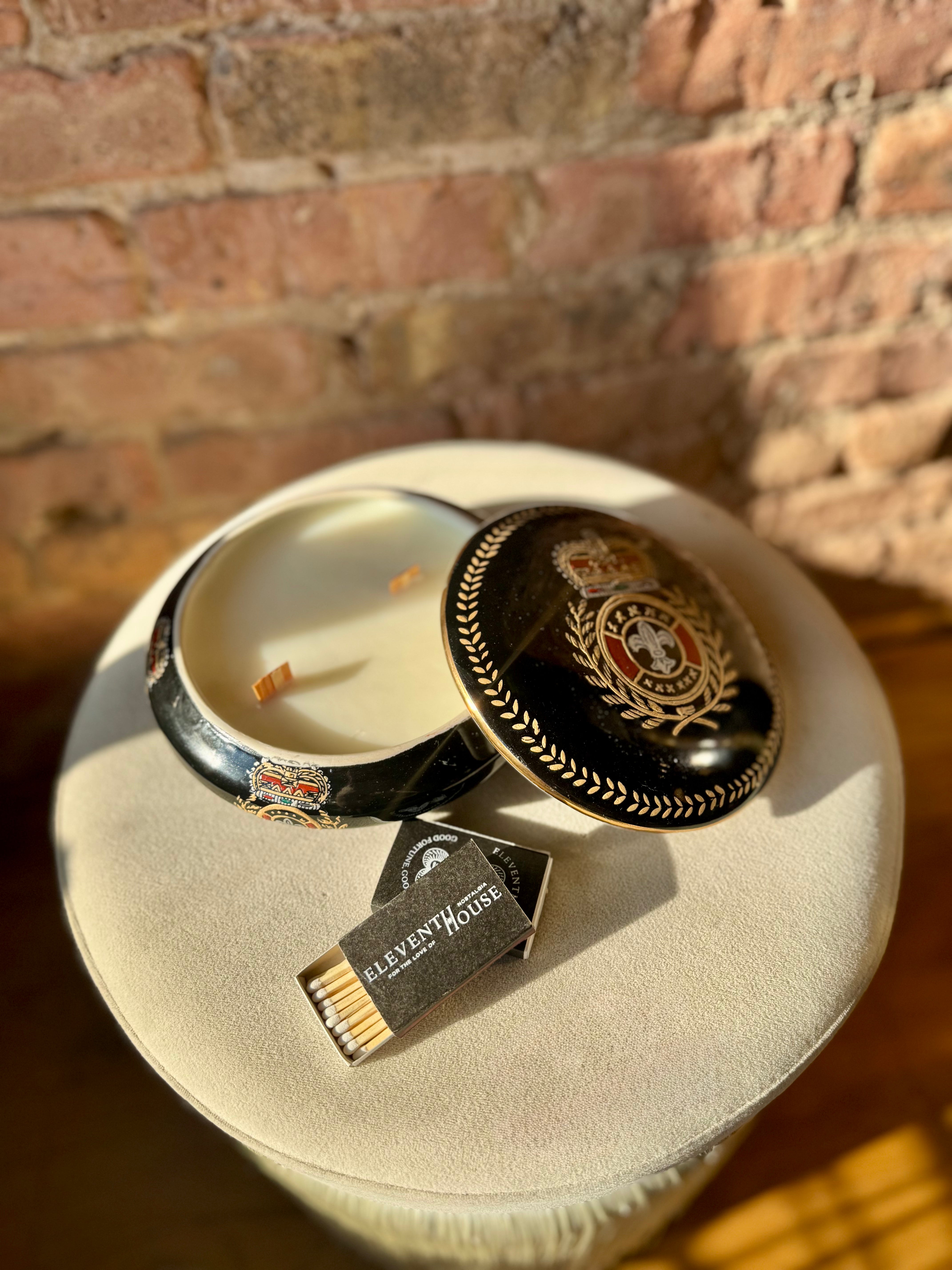 Eleventh House antique candle vessel after being filled with non-toxic wax and wooden wicks
